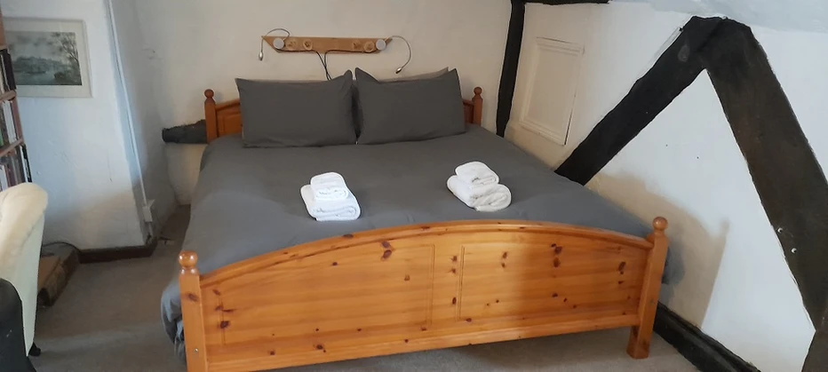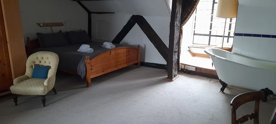 This room has wall-to-wall fitted carpets and thick curtains. Room facilities include an ensuite shower room, toilet, and sink, with hot and cold running water. The room has provision for complimentary tea, coffee, and biscuits, with bottled water in the mini fridge. The king-size bed has a king-size duvet, and there are two single beds with single duvets. Extra blankets are stored in the wardrobe. Free WiFi is supplied, along with one desk. The three armchairs and desk chair can be moved around the room to your preference or in front of the large television. The window gives a view of the High Street, and the alcove offers a view of the rooftops and St Mary’s Church tower.
