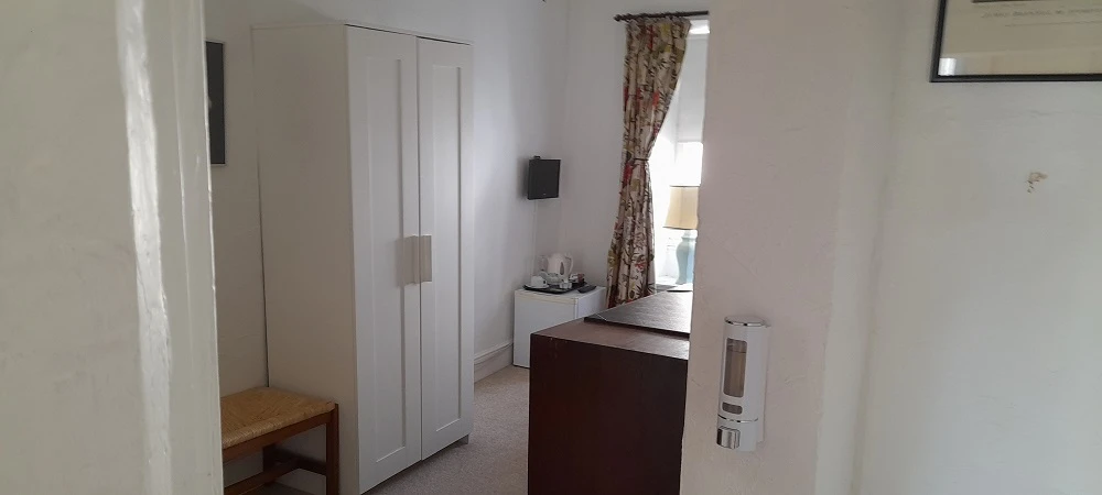 This room has wall-to-wall fitted carpets and thick curtains. Room facilities include an ensuite shower, toilet, and sink, with hot and cold running water. The room has provision for complimentary tea, coffee, and biscuits, with bottled water in the mini fridge. The single bed has a single duvet, with extra blankets stored in the wardrobe. The television can be watched from the bed. Free WiFi is supplied, along with elegant desk space. The window gives a view of the High Street.