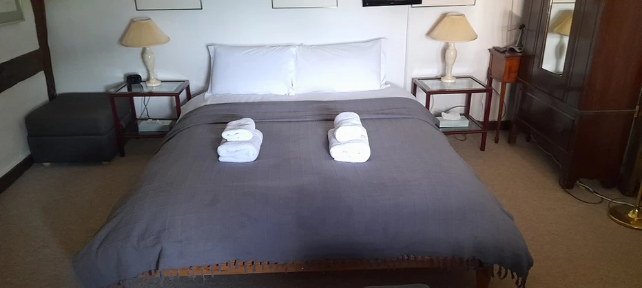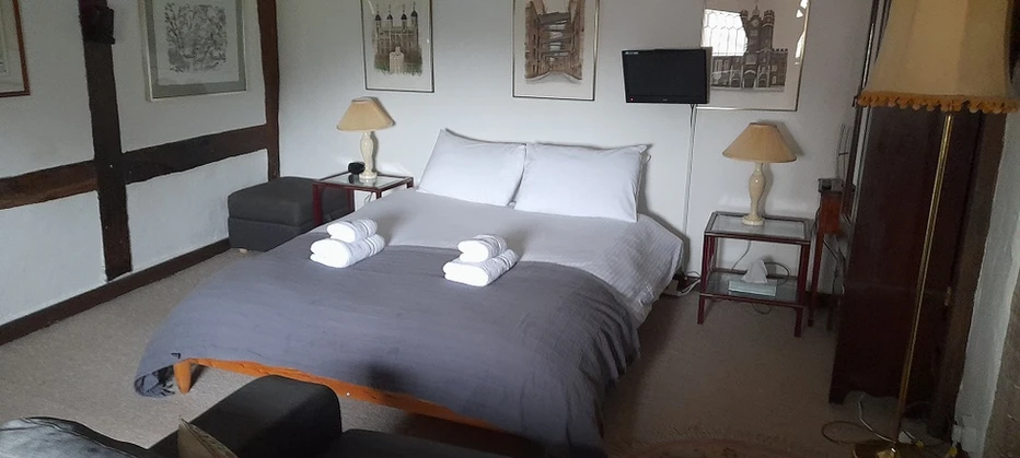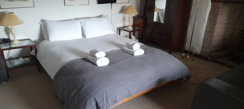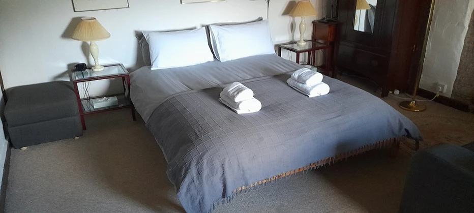 This room has wall-to-wall fitted carpets and thick curtains. Room facilities include an ensuite shower room, toilet, and sink, with hot and cold running water. The room has provision for complimentary tea, coffee, and biscuits, with bottled water in the mini fridge. The double bed has a double duvet, with extra blankets stored in the wardrobe. There is a sofa and television, and free WiFi is supplied. The windows give a view of the garden.